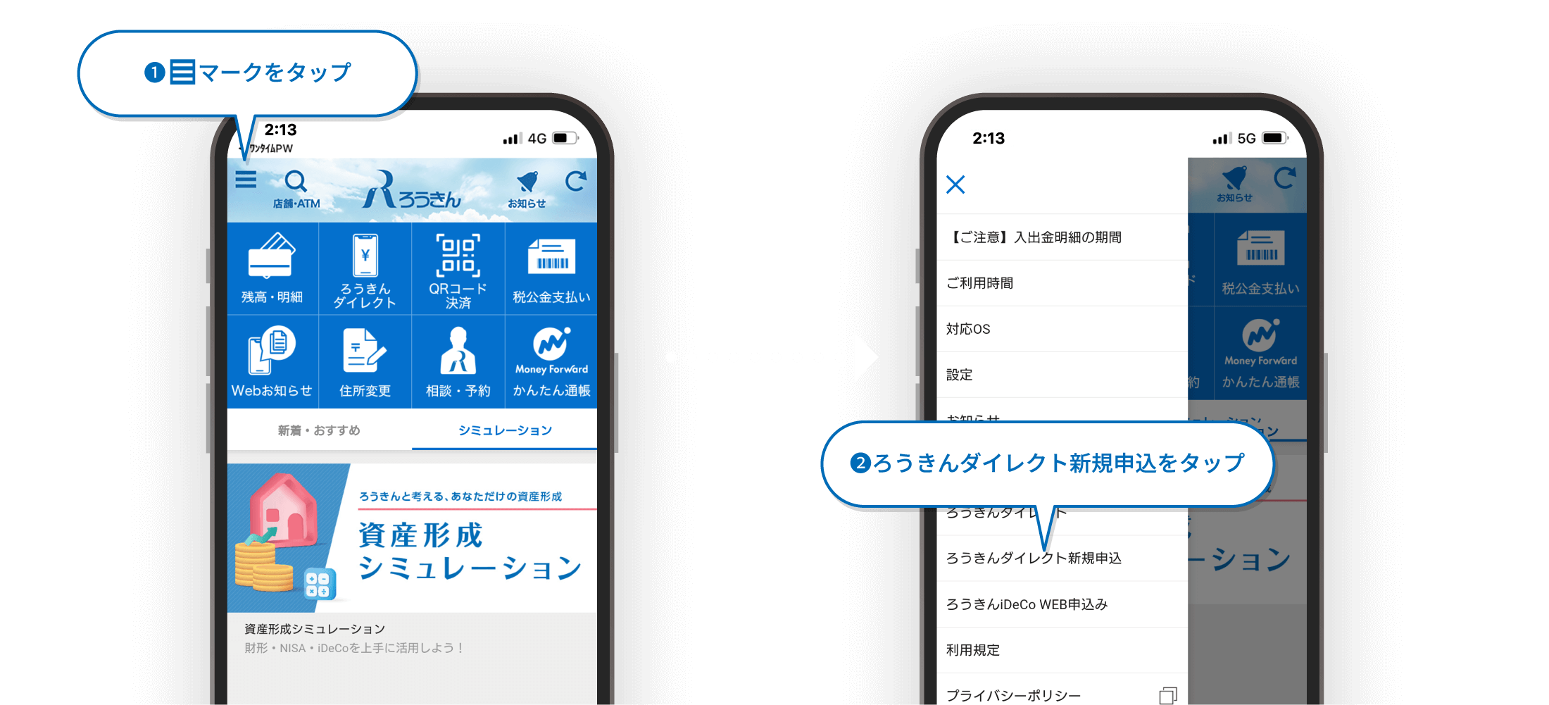左上のマークから「ろうきんダイレクト新規申込」を選択してください